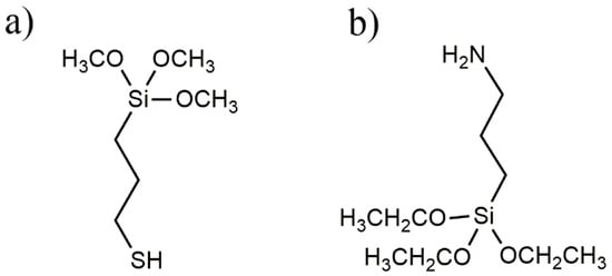 (3-mercaptopropyl) trimethoxysilane (MPTMS) and 96% ethanol were purchased from VWR (Milan, Italy) and used without further purification; (3-aminopropyl)triethoxysilane (APTES) was purchased from Sigma-Aldrich (Darmstadt, Germany). Both MPTMS and APTES are soluble in ethanol and insoluble in water. The chemical formulae of MPTMS and APTES are given in Figure 1.