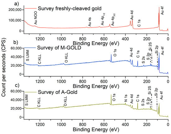 XPS was used for characterizing the freshly cleaved gold surface before and after functionalization with MPTMS (M-Gold). M-Gold grafted with APTES is named A-Gold. XPS allows the identification of the elements, of their chemical state and the determination of the surface composition. The survey spectrum of freshly cleaved gold before the functionalization is reported in Figure 4a. The spectrum shows the presence of a barely visible C 1s signal due to a short-time exposure to the ambient, together with peaks ascribed to gold; no O 1s signal was detectable.