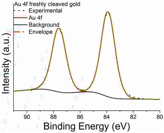 Figure 5 shows the curve-fitted high-resolution Au 4f signal after background subtraction with U 3 Tougaard model. Au 4f peaks were fitted with a doublet due to the spin-orbit coupling being the energy separation between the 4f7/2 and 4f5/2, taken equal to 3.7 eV, and the area ratio equal to 4:3. The full width at half-maximum height (FWHM) was 1.2 eV for both the components. The details on the line shape of the signals and on the constraints adopted for the curve fitting are reported in Table 1 and are in agreement with the literature [27,37].