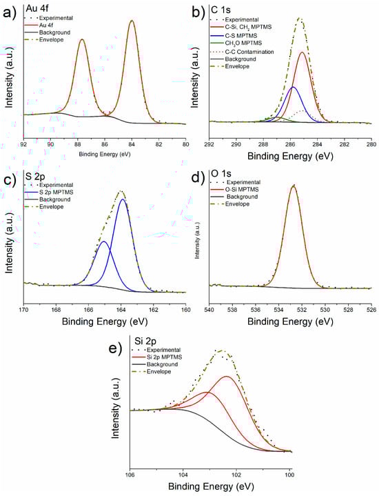 Representative high-resolution C 1s, S 2p, Si 2p, O 1s and Au 4f spectra are shown in Figure 6. The spectra were acquired for investigating the chemical state of the elements and for the quantification. The binding energies of the different components of C 1s, O 1s, S 2p and Si 2p signals revealed on the M-Gold samples are listed in Table 2, where the apparent atomic concentration (at%) of each component of the elements present in the MPTMS layer is also reported. The apparent composition was calculated assuming the in depth-homogeneity of the layer.