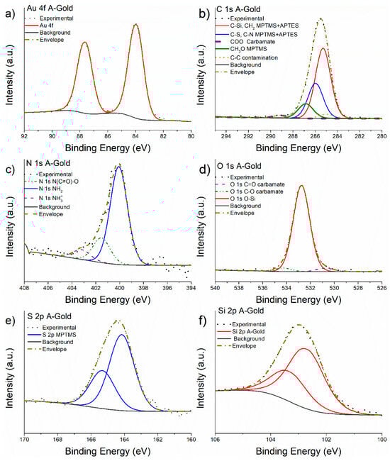 The high-resolution spectra of Au 4f, C 1s, N1s, O 1s, S 2p and Si 2p are shown in Figure 7. The same curve-fitting parameters and constraints used for M-Gold spectra (Table 1) were applied in this case. The binding energy values of the different components of the most intense photoelectron lines and the results of the quantitative analysis are provided in Table 3.