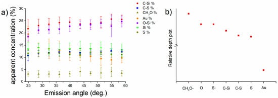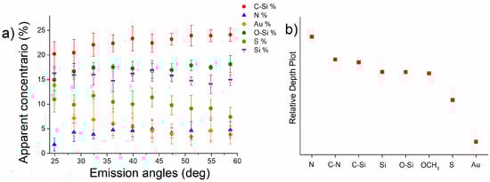 Apparent concentration vs. emission angles calculated for Au, Si, S, C-Si, O-Si and N of the A-Gold samples (a) and relative depth plot calculated considering the elements: N, Si, O, S and Au of MPTMS and APTES for A-Gold samples (b).