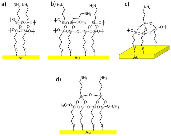 Figure 10a shows the expected result according to [4], but on the basis of the results obtained in this work (Table 3) is not in agreement with this stoichiometry. Additionally, the reaction schemes shown in Figure 10b,c, between three molecules of MPTMS with one of APTES and a ratio of 3:1, can be ruled out on the basis of the experimental results, which lead to a 2-to-1 sulphur-to-nitrogen ratio and 3:1 for a Si:N ratio. Thus, the most probable structure of the APTES in A-Gold samples is shown in Figure 10d (Table 3).