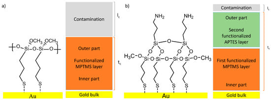 Based on the reaction scheme and the results from ARXPS measurements (relative depth plot in Figure 8b and Figure 9b), the models for the functionalized M-Gold (Figure 11a) and A-Gold (Figure 11b) are proposed. The model of M-Gold consists of three layers: the gold substrate on which the MPTMS is bounded via sulphur and a hydrocarbon contamination layer.