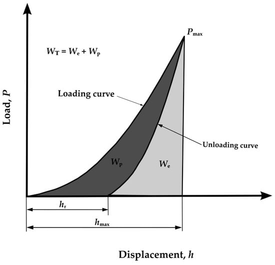 Schematic illustration of a typical load–displacement (P-h) curve obtained from a nanoindentation test of an elastoplastic material. The elastic work (We), plastic work (Wp), maximum penetration depth (hmax), and residual depth (hr) are also shown.