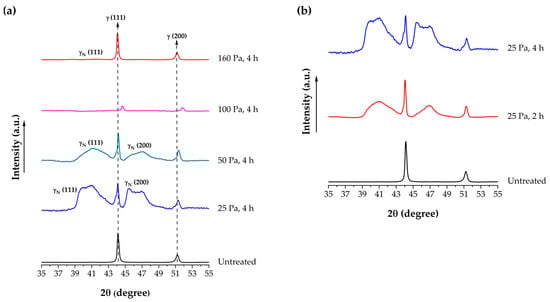 Figure 3 shows the X-ray diffraction patterns for samples that were nitrided for 4 h at pressures ranging from 160 to 25 Pa and for a sample that was nitrided for 2 h at 25 Pa. The XRD patterns of the untreated sample are also included. The peaks at (111) and (200) of the austenite γ phase (JCPD 00-033-0397) with a face-centered cubic (fcc) crystalline structure and lattice parameter (a) of 0.355 nm were identified. Additional leveled peaks γN were identified and associated with a nitrogen-rich phase, called the S-phase or expanded austenite. This phase possesses a higher lattice parameter (a111 = 0.381 nm and a200 = 0.386), a consequence of the lattice distortion that is induced by the introduction of nitrogen in different concentrations within the interstitial sites of the cubic structure. The lattice parameter depends on the crystallographic orientation, due to the crystallographic anisotropy of the interstitial nitrogen. One explanation for this phenomenon is the formation of stacking faults and high compressive residual stresses in the nitrided layer, which produces an fcc crystal lattice with significant disorder and distortion [65].