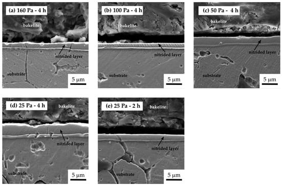 Cross-section FESEM micrographs of samples nitrided for 4 h at pressure of (a) 160 Pa, (b) 100 Pa, (c) 50 Pa, and (d) 25 Pa and for 2 h at (e) 25 Pa.