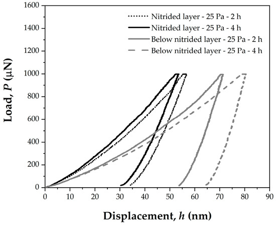 Load–displacement curves of nitrided layers and below after nanoindentation tests in 316L plasma-nitrided steel at 25 Pa during 2 h and 4 h.