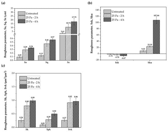 Three-dimensional surface roughness profile parameters of the untreated sample and nitrided sample under a working pressure of 25 Pa, with durations of 2 h and 4 h. (a) Sa, Sq, and Sz. (b) Ssk and Sku. (c) Sk, Spk, and Svk.