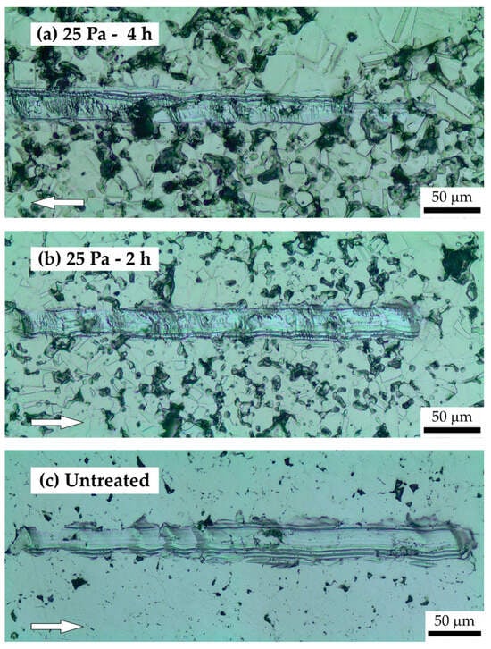 Optical microscopy images of scratch tracks of the sintered 316L samples: (a) 25 Pa and 4 h nitriding; (b) 25 Pa and 2 h nitriding; (c) untreated. Progressive load scratch test. White arrows indicate the direction of the stylus displacement on the sample.