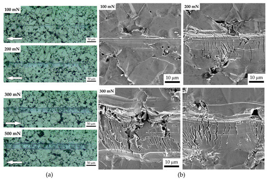 Figure 7 shows the optical microscopy images of the scratch tracks on the substrate (untreated steel) and the nitrided layer from the progressive load scratch tests, with a normal load ranging from 100 to 500 mN. As in the optical images, the FESEM micrographs (Figure 8b) of the scratch tracks show the brittleness of the nitrided layers, which is attributed to their high hardness. A detailed examination of Figure 7 and Figure 8 indicated that mixed damage modes occurred, related to the brittleness and roughness of the modified surface and ductility and porosity of the sintered substrate. These features may influence the stylus contact area during the scratch tests of the material and, hence, the type of surface damage [81,82]. For the scratch test at 100 mN, almost no cracks were observed, while for the higher applied loads, cracks propagated in a perpendicular direction to the scratching movement. The distance between cracks seems to increase as the applied load is increased. Ductile tensile cracks and spallation can be observed.