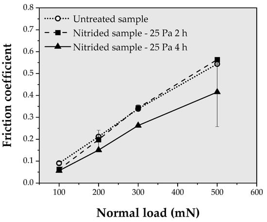 Figure 9 shows the average friction coefficient obtained from the instrumented scratch tests in constant load mode. The friction coefficient became higher as the normal load increased for all the samples. The sample treated for the longest time (4 h) showed an average friction coefficient that was lower than the other samples, and this trend was more pronounced as the normal load was increased. As the scratch test stylus reached the substrate, the friction coefficient values observed in Figure 9 for the untreated and two-hour treated samples tested at 200 mN, 300 mN, and 500 mN normal loads are comparable. The lower values of friction coefficient of the four-hour sample carry a smaller substrate effect.