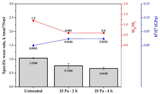 The values of the specific wear rate are shown in Figure 10. This term represents the volume of material loss by scratching wear per unit of normal load per unit of sliding distance. The values of the Wp/Wt and H3/H2 ratios of the samples are also shown in Figure 10. The H3/E2 ratio indicates the resistance to plastic deformation that is also used to describe and rank the wear resistance of layers and coatings [79,84].
