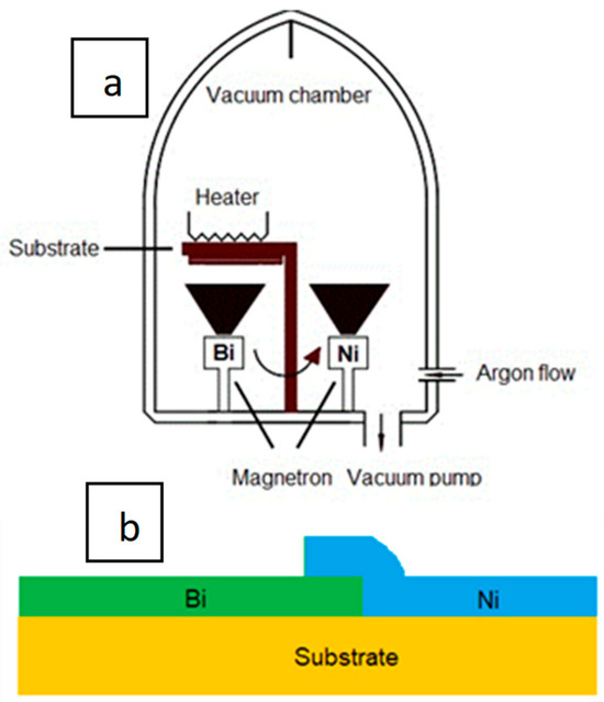 Bilayer structures composed of bismuth and nickel were grown utilizing DC magnetron sputtering within an argon gas environment, maintaining a pressure (p) of 1.33 Pa to ensure deposition process stability. To regulate the gas environment, an argon flow meter connected to the chamber enabled the adjustment of oxygen gas flow rates within the range of 0 to 500 cm3/min. The bismuth and nickel disc targets, each possessing a 3-inch diameter, were sourced from Kurt J. Lesker Company in Jefferson Hills, PA, USA, with a noteworthy purity of 99.95%. The spatial arrangement of the deposition system involved maintaining a constant distance of 6 cm between the magnetrons and the substrate, as illustrated in Figure 1a. Notably, the fixed target currents for bismuth and nickel were set at 0.2 A and 0.5 A, respectively. During the magnetron deposition process, the samples were subjected to a controlled heating mechanism, maintaining a substrate temperature of 423 K. Elevating the substrate temperature serves a dual purpose: enhancing adhesion between the deposited layers and the substrate, and augmenting the energy and mobility of atoms on the substrate surface. This strategic manipulation of temperature contributes to the overall quality and characteristics of the deposited bilayer structures. The deposition times for bismuth and nickel were precisely delineated at 5 min and 10 min, respectively. This temporal control plays a pivotal role in determining the thickness and properties of the resultant layers, ensuring a tailored approach to achieving the desired bilayer structure. In summary, this detailed deposition process involves a comprehensive control strategy, encompassing gas flow rates, pressure, target currents, substrate temperature, and deposition times. The thickness of each layer was about 50–100 nm.