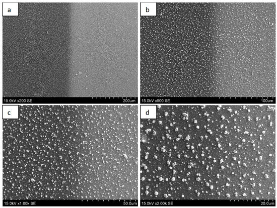 SEM images of TEG (Bi-Ni) surface captured at different zoom levels: (a) zoomed 200×; (b) 500×; (c) 1000×; and (d) 2000×.