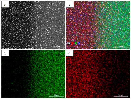 Figure 3 shows the elemental distribution of the TEG (Bi-Ni) layer on the surface using the EDS method. Figure 3a shows an image of the surface of the TEG (magnification of 1000) obtained using SEM, which measured the distribution of the elemental composition on the surface. Figure 2b shows the surface distribution of bismuth, nickel, and oxygen. As it can be seen, the red color represents the distribution of nickel, the green color bismuth, and the blue color the oxygen on the surface. A clear Bi-Ni junction boundary is also visible in this figure. Figure 3c shows the surface distribution of bismuth (green), while Figure 3d shows the surface distribution of nickel. According to the color distribution of the elements, both Bi and Ni layers can be identified in the SEM images. In this case, in the previous SEM images, the brighter area represents the Bi layer, while the darker one the Ni layer.