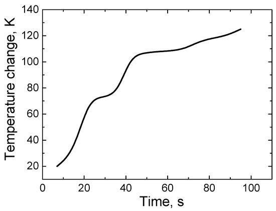 As the results of the measurements show, during this study, the maximum potential difference of the TEG used—about 0.35 V—is reached in approximately 100 s. As is known, the potential difference of TEG is partially correlated with the variation of temperature difference. As we can see from the results, the growth of the potential difference over time is not a smooth process, due to the interaction of part of the TEG surface area with the environment. Hence, in real working conditions, the growth of the TEG potential difference over time is not an ideal linear dependence (a part of the TEG surface will always be in contact with a colder environment). In addition, it can be observed that the TEG potential difference begins to grow noticeably after heating for 25 s (which corresponds to a temperature difference of about 80 K). This can be explained by the fact that with such a temperature difference, the electrons in the warm part of the TEG acquire enough kinetic energy and participate in the phenomena of electric current formation.