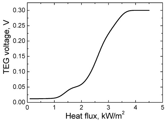 As it can be seen from the measurement results, as the heat flux increases from 0 to 4.5 kW/m2, the electrical potential difference increases from 0 to 0.35 V. The greatest change in the growth of the potential difference (from 0.06 to 0.35 V) is observed when the heat flux increases from 2 to 4 kW/m2. Such an uneven growth of the potential difference can be explained by the fact that the active TEG surfaces receive heat from a heat source or radiation by contact. Also, as already mentioned, heat flux transfer to the TEG surfaces depends on the quality of the contact between the TEG surface and the heat source. It can be noticed that with a heat flux higher than 4 kW/m2, the potential difference generated by the TEG does not change. Hence, at this value of the heat flux, the maximum number of accelerated electrons which participate in the process of electric current transfer is reached.