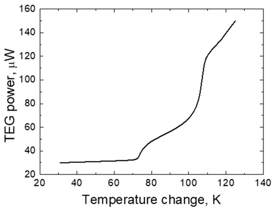 Figure 10 shows the dependence of the power generated by the TEG element on the resulting potential difference. As it can be seen from the results, the power dependence graph consists of two straight lines. The first part of the graph shows that the TEG power increases from 50 to 110 µW when the electric potential difference increases from 0.03 to 0.1 V. Meanwhile, as the voltage increases from 0.01 to 0.3 V, the power increase is slower, from 110 to 135 µW.