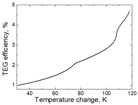As it is known, the TEG has low efficiency in producing electric current. It is stated in the literature that TEG efficiency varies between 1 and 10% [1,2,3]. The dependence of the efficiency factor of the Bi-Ni-based TEG element on the temperature change is presented in Figure 12. As the measurements show, efficiency increases from 1 to 4.5% when the temperature change increases from 30 to 119 K.