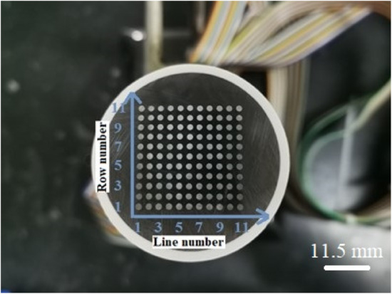 One hundred and twenty-one (121) carbon steel wires (material: Q235; diameter: 1.5 mm) were arranged in an array of 11 × 11 and sealed with an epoxy zinc-rich primer, and each wire was separated by 1.0 mm (Figure 1). The area of a single carbon steel wire was 1.77 mm2, and the total area of the wire beam electrode was 213.69 mm2. The electrode surface was abraded with 600–1200# silicon carbide papers on an automatic metallographic polishing machine and cleaned with ethanol and acetone. The epoxy zinc-rich primer was coated on the electrode surface and cured at room temperature for 7 days. Then, the epoxy resin (E44) was coated on the epoxy zinc-rich primer and cured for 7 days to prepare the epoxy/epoxy zinc-rich composite coating.
