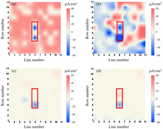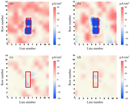 Evolution of current density distribution with time under immersion times of (a) 1 h; (b) 24 h; (c) 1314 h; (d) 2400 h.