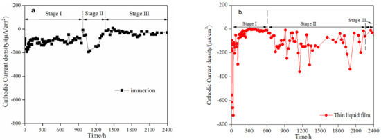 Variation in the cathodic current density in the defective areas under the (a) immersion and (b) thin liquid film conditions.