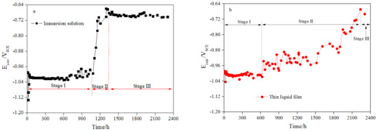 Evolution of OCP with immersion time under the (a) immersion and (b) thin liquid film conditions.