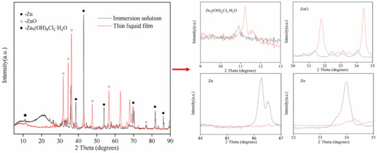 Figure 8 shows that the strength of the Zn5(OH)8Cl2·H2O phase and ZnO phase under the liquid film condition is higher than that under the immersion condition, while the strength of the Zn phase under the liquid film condition is lower than that under the immersion condition. The zinc particles were less oxidized under the immersion condition, the zinc particles were consumed seriously under the atmospheric liquid film condition, and a large number of zinc corrosion products were generated.