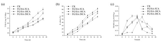 TVB-N indicates the content of volatile basic compounds and is one of the main indexes to determine the freshness in turbot []. Many basic volatile compounds are formed during the decomposition of proteinaceous and nonproteinaceous nitrogenous compounds. During cold storage, the spoilage bacteria degraded the proteins in the fish muscle and accumulated rapidly. As shown in Figure 2a, the turbot sample had a TVB-N value of 11 mg N/100 g on day 0. This indicates that the turbot samples were in a fresh state before treatment. In the above analysis, turbot also had a low initial TVC value, both of which testified to its freshness. During cold storage, TVB-N values increased due to bacterial growth and multiplication. The allowable threshold of TVB-N is 25 mg N/100 g [] for marine fish. The turbot in the CK sample exceeded the acceptable limits for TVB-N values after 12 days of storage. Notably, all turbot treated with FG/SA-CA had lower TVB-N values. In particular, these values in the FG/SA-10CA and FG/SA-20CA groups remained below the limit throughout the cold storage. These two active coatings could therefore lead to reduced spoilage. This indicates that FG/SA-C inhibits microbial growth and slows down protein breakdown and amine production. Additionally, the TVB-N value of turbot treated with a high concentration of carvacrol was lower. The FG/SA-5CA group enabled a longer shelf life of about 4 d, and the FG/SA-10CA and FG/SA-20CA groups extended the shelf life by about 6 d. This is analogous to the findings of Li et al. [], who found that TVB-N values were reduced when sea bass were treated with high concentrations of eugenol.