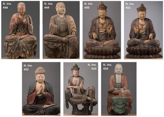 This contribution focuses on a selection of seven polychrome wooden sculptures from the Museo d’Arte Orientale (MAO) in Turin, Italy, which have recently undergone an in-depth technical study and conservation treatment at the Centro per la Conservazione ed il Restauro dei Beni Culturali (CCR) “La Venaria Reale” (Figure 1). These objects, never exhibited until recent times, are generally described in the museum entries as being of Chinese origin, specifically from the late Ming–early Qing dynasties (16th–18th centuries), based merely on stylistic and iconographic considerations.