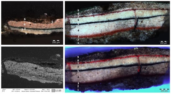 Paint stratigraphy, cross sections from Inv. 448 and 449. Polarized light (top left) and BSE (bottom left) images of a cross section from Inv. 448; the sequence of paint layers includes (1) lithopone with presence of silicon, (2) lithopone, (3) green earth with traces of chrome green, (4) lithopone with earth pigments, (5) ultramarine blue, and (6) organic layer. Polarized light (top right) and UV (bottom right) images of a cross section from Inv. 449; the sequence of paint layers includes (1) wooden support, (2) calcium carbonate with minor silicate inclusions, (3) earth pigments, (4) lithopone, (5) carbon-based black, (6) lithopone, (7) red lake with aluminum silicate substrate, (8) lithopone with traces of silicates, and (9) organic layer.