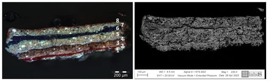 Paint stratigraphy, cross section from Inv. 453. Polarized light (left) and BSE (right) images of a cross section from Inv. 453; the sequence of paint layers includes (1) lithopone with sparse earth pigments and ultramarine blue, (2) earth pigments, (3) lithopone with sparse earth pigments and ultramarine blue, (4) carbon-based black, (5) lithopone with sparse calcium carbonate inclusions and earth pigments, (6) ultramarine blue, (7) lithopone with sparse earth pigments, and (8) minium.