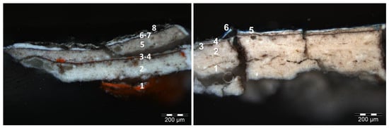 Paint stratigraphy, cross sections from Inv. 454. Polarized light images of cross sections from Inv. 454; the sequence of paint layers includes at (left) (1) minium, (2) lithopone, (3) carbon-based black, (4) minium, (5) lithopone, (6) carbon-based black, (7) lithopone and titanium white, and (8) organic layer; at (right) (1) lithopone, (2) lithopone with sparse earth pigments, (3) carbon-based black, (4) lithopone, (5) titanium white, and (6) titanium white and phthalocyanine blue.