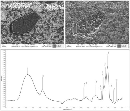 SEM investigation of the cross sections removed from Inv. 454 highlighted the presence of organic lumps with rounded to irregular shapes within the stratigraphy, most of which are embedded in the lithopone-based ground layers. These lumps, showing variable sizes (30–120 µm width × 10–50 µm height), consist of aggregates of polyhedral granules of about 3 µm diameter. Micro-ATR-FTIR analysis identified this material as starch; according to the literature [,,], the observed granule size is most compatible with rice starch, normally falling into the 2–7 μm range (Figure 6). The abundance and distribution of these starch lumps suggest that they might have been added intentionally, although different hypotheses on their purpose may be entertained. Finally, examining the SEM images collected from the cross sections of all seven sculptures, the presence of rice starch lumps was also hypothesized for Bodhisattvas Inv. 450 and 451, and for Guanyin Inv. 453, based on morphological data. However, in these three sculptures, the aggregates typically have smaller sizes than in Inv. 454.