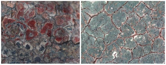 Surface condition. Microphotographs of the surface condition in Inv. 450 (left) and Inv. 449 (right), showing multiple layers of polychromy and severe paint cracking.