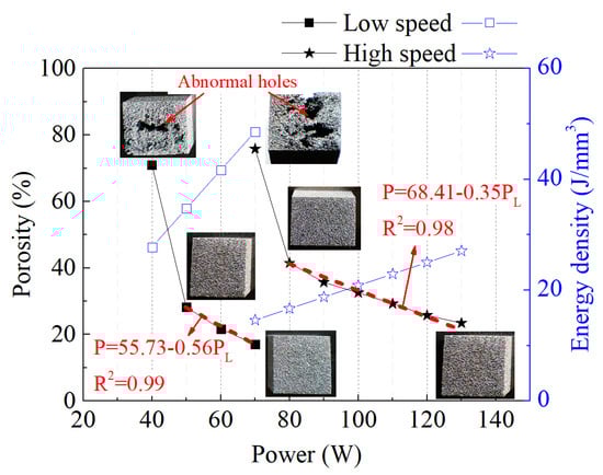 Porosity of microporous 316L samples printed by LPBF as a function of the different laser power at two scanning modes of low laser scanning speed (600 mm·s−1) and high laser scanning speed (2000 mm·s−1): red dash lines are the fitted lines with the fitted equations to the corresponding data, where P and PL represent porosity and laser power, respectively.