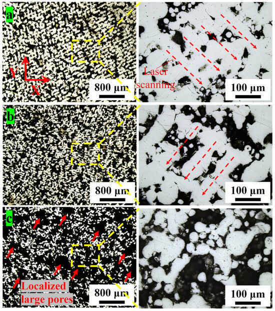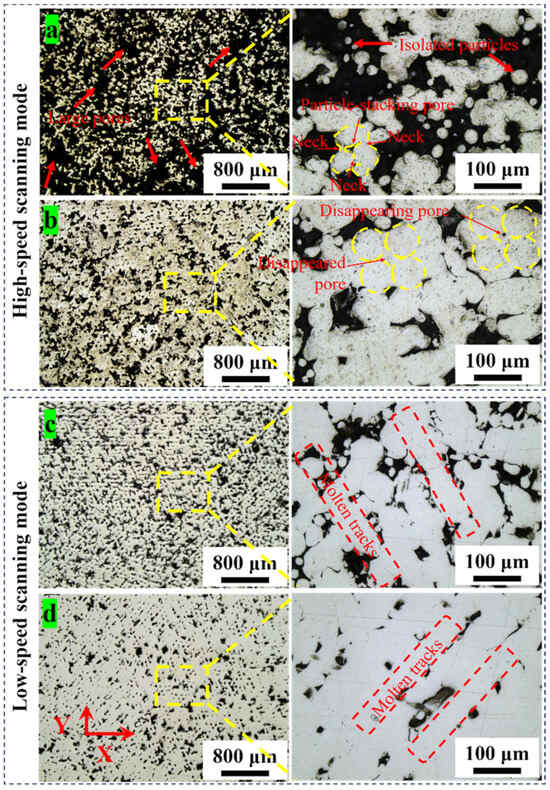 To analyze the effect of laser power on the porous structure, the morphology of the corresponding cross-sectional microstructure of the as-printed microporous 316L was examined, as shown in Figure 4. It was found that the particle-stacking microporous structure showed an irregular pore morphology formed by the interaction of “particle-to-particle” overlapping and stacking. This was quite different from the pores with a spherical morphology caused by some bubbles remaining in the molten pools because the rapid cooling rate of the laser prevented them from escaping out of the metal melts before complete solidification [35]. Typical sintered necks were clearly observed on the overlapping joints between the particles, as indicated by the yellow mark in the magnified image in Figure 4a. The pores of the “HS” mode were distributed randomly, especially in its low-power sample, which containined a lot of localized large interconnected pores. Many isolated small spherical particles were observed within the pores, indicating that they were most likely caused by the splash deposits. Many smaller spherical pores formed within the sintered struts because of rapid solidification at a high scanning speed. In the high-power sample, the number of localized large pores was clearly reduced, whereas the high power led to excessive overlapping of molten particles, resulting in the disappearance of pores within the bands. This could be confirmed by the red mark in the magnification of Figure 4b.