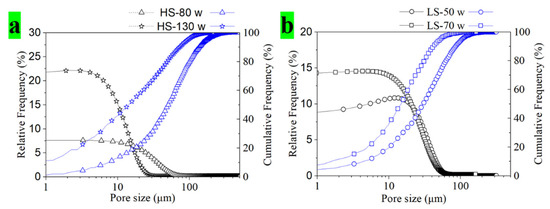 Pore size distribution of microporous 316L samples fabricated with different laser power at two modes of high-speed scanning and low-speed scanning: (a) a high scanning speed of 2000 mm·s−1 and (b) a low scanning speed of 600 mm·s−1.