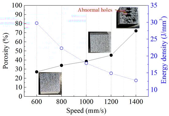 Based on the “LS” mode with an ideal pore distribution, as previously discussed, we attempted to raise the porosity and, meanwhile, further optimize the pore structure by appropriately increasing laser scanning speed. Figure 6 shows the porosity of microporous 316L fabricated with a fixed laser power of 60 w, and the laser scanning speeds varied from 600 mm·s−1 to 1400 mm·s−1 at 200 mm·s−1 intervals. With the increase in laser scanning speeds, the porosity increased from 27.03% to 72.11%, which is much higher than that of “LS”. This is because increasing the scanning speed reduces the contact time between the laser and particles at constant laser energy, which indirectly decreases the amount of energy received by the particles per unit time. It is worth noting that the porosity increased by 57.08% when the laser scanning speed increased from 1200 mm·s−1 to 1400 mm·s−1. However, the porosity increased by only 17.31% when the laser scanning speed increased from 1000 mm·s−1 to 1200 mm·s−1 with the same increment. This corresponds to the macroscopic defects of abnormal holes (see the red mark in Figure 6) generated owing to some unmelted particles with insufficient laser energy when the laser scanning speed increased to 1400 mm·s−1, which indicates that the particle-stacking porous structure could not be formed normally beyond this speed.