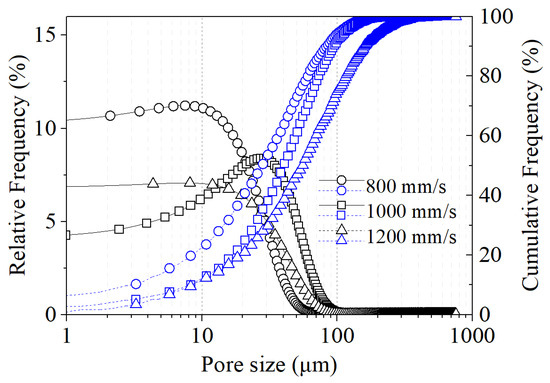 Figure 8 shows the size distribution at different laser scanning speeds. Similarly, the pore size distributions showed the same semi-Gaussian distribution, concentrated on the left side, indicating that the porous structures also had a high percentage of fine pores. With the increase in scanning speed, the percentage of pores distributed in the small size range (<100 μm) gradually decreased, and on the other hand, large pores continuously appeared, even some localized large pores over 500 μm.