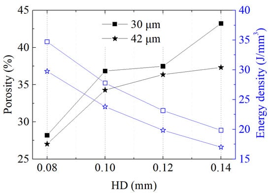 Porosity of microporous 316L fabricated using LPBF as a function of the different hatch distances at two-layer thicknesses of 30 μm and 42 μm.