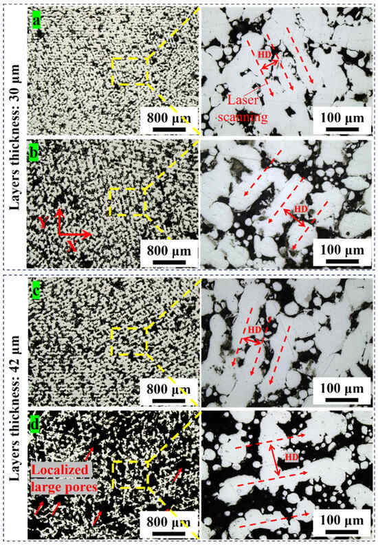 Correspondingly, the microstructures of the microporous 316L samples fabricated with different HD at two LTs of 30 μm and 42 μm are shown in Figure 10. All pores displayed irregular morphologies distributed homogenously along the molten tracks and laser scanning routes (see further details in the magnifications). The distances between the two adjacent molten tracks were consistent with the set HD used in the printing parameter, as verified by the red dashed lines in the magnifications in Figure 10a–d. With increasing HD, the porous structure changed from a particle-stacking net porous structure with small pores to large interconnected pores, illustrating that the pore structure can be arranged using the laser-scanning routes. Comparing the two LT samples, a large LT indicates that less energy is distributed per particle, making localized large pores more likely to appear, which agrees with the porosity results.