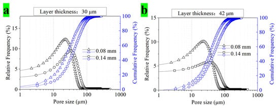 Pore size distribution of microporous 316L samples fabricated with different HD at two LTs of 30 μm and 42 μm: (a) an LT of 30 μm and (b) an LT of 42 μm.