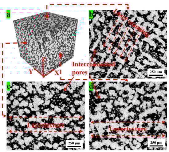 To observe the overall pore structure, the three-dimensional microstructure of microporous 316L was examined using a 3D X-ray microscope, as shown with the computed tomography in Figure 12. The CT image showed that the sample formed a microporous structure with interconnected pores. The pores in the XY plane (Figure 12b) were evenly distributed along the direction of the laser scanning routes and were mainly interconnected along the molten tracks, whereas those in the planes (Figure 12c,d) in the Z direction showed a relatively disordered distribution and were mainly linked along the layered direction. Within the pores, many unmelted particles were adsorbed on the struts. Struts formed by particle-to-particle overlap in the molten tracks and layer textures were clearly observed. Comparatively, the distribution of the struts in the XY direction, dominated by low laser power, rapid laser scanning, and large hatch distance, was more organized than those determined by the layer thickness and laser impacting pressure in the Z direction, indicating that the pore distribution was more controllable in the horizontal direction by controlling the laser scanning route with proper laser parameters.