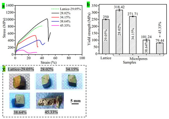 Compressive performances of the particle-stacking microporous 316L with different porosities, with a representative sample of lattice porous 316L as a comparison: (a) representative stress-strain curves, (b) morphologies of the fractured samples, and (c) yield strength.