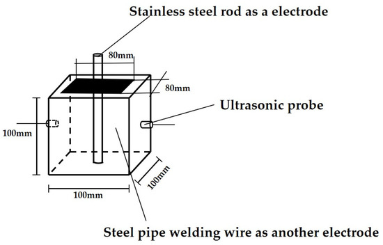 The AC electrical resistance of concrete-filled steel tubes was analyzed using a TH2827C precision LCR digital bridge provided by Shenzhen Lexin Intelligent Testing Technology Co., Ltd., Shenzhen, China. The measuring voltage and frequency were 1 V and 104 Hz, respectively, corresponding to the sampling frequency of 10 Hz. The Wellington RST5060F Electrochemical Workstation, purchased from Honghua Instrument Equipment Industry and Trade Co., Ltd., Gongyi, China, was used to plot the AC impedance spectrum curves. The frequency settings of the Electrochemical Workstation ranged from 105 Hz to 1 Hz with an AC voltage of −10 mV~10 mV. Figure 1 shows the measuring process of ultrasonic and electrical performance parameters.