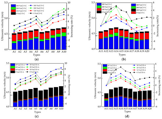 The ultrasonic velocity of concrete-filled steel tube: (a) with a single rust inhibitor, after NaCl F-C; (b) with an assembly unit of rust inhibitors, after NaCl F-C; (c) with a single rust inhibitor, after NaCl D-A; (d) with an assembly unit of blended rust inhibitors, after NaCl D-A.