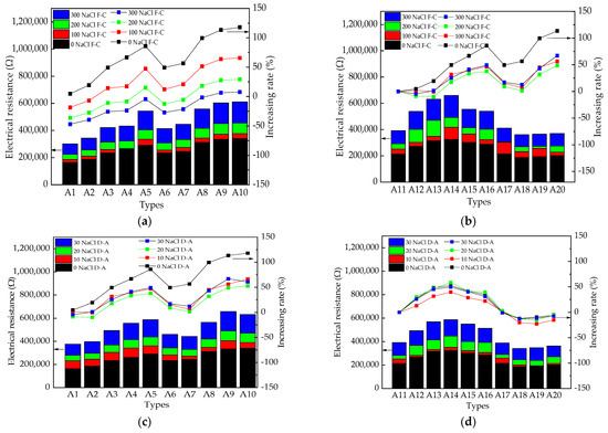 The electrical resistance of steel tubes: (a) with a single rust inhibitor, after NaCl F-C; (b) with assembly unit of rust inhibitor, after NaCl F-C; (c) with a single rust inhibitor, after NaCl D-A; (d) with assembly unit of rust inhibitors, after NaCl D-A.