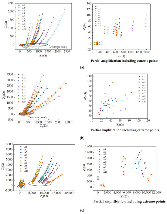 Figure 5 depicts the AC impedance spectrum curves of the concrete-filled steel tubes. In Figure 5, Zr values represent the actual electrical resistance values in the AC impedance spectra, while Zi values represent the electrical reactance values. The interface between the steel pipe and concrete, the interface between aggregate and cement mortar, and the interface between the liquid phase and solid phase of the pore solution are the mechanisms involved in concrete-filled steel pipes [23]. Therefore, the capacitance value in concrete-filled steel pipes is relatively high. The maximum values of electrical resistance increased with the increase in the number of NaCl F-C and NaCl D-A actions since the NaCl action can accelerate the corrosion of steel pipes and the cracking of concrete, hindering the propagation of the charged particle [32]. Consequently, Zr increased by the NaCl action. After the NaCl action, Zr decreased by adding the rust inhibitor owing to the fact that the rust inhibitors delayed the corrosion of steel pipes, thereby reducing the increasing rate of the electrical resistance of concrete-filled steel pipes after the NaCl action [33]. The concrete-filled steel tubes with the assembly unit of 5 kg/m3 Na2MoO4 and 15 kg/m3 benzotriazole had the highest Zr corresponding to the peaks observed in AC impedance spectrum curves.